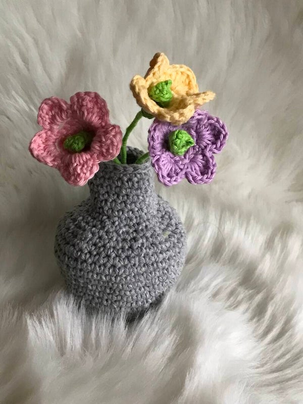 Zo leuk om te maken en super leuk als duurzaam cadeautje! Stap voor stap met foto's wordt in dit patroon uitgelegd hoe je het trosje bloemetjes maakt. Ook het vaasje wordt beschreven. Dit geheel is een sieraad voor je kamer! Vaasje en bloemetjes worden in totaal ongeveer 18 cm hoog.
