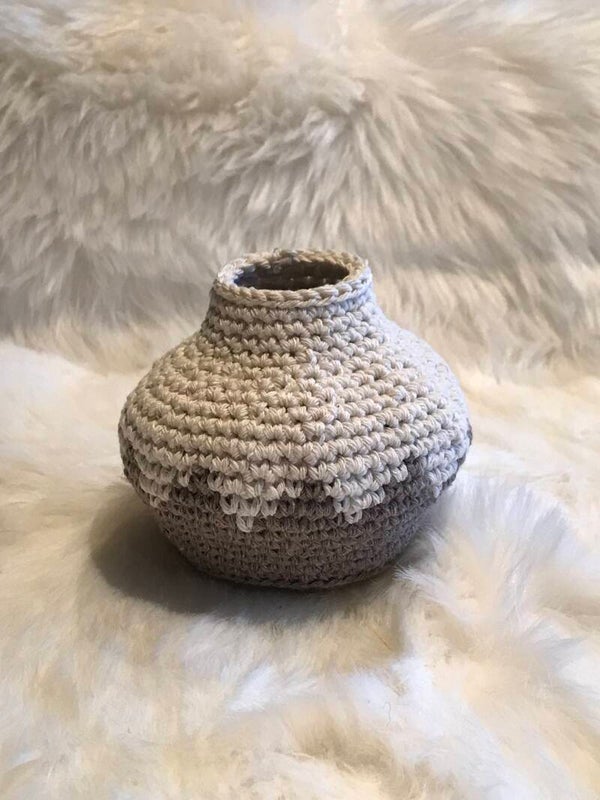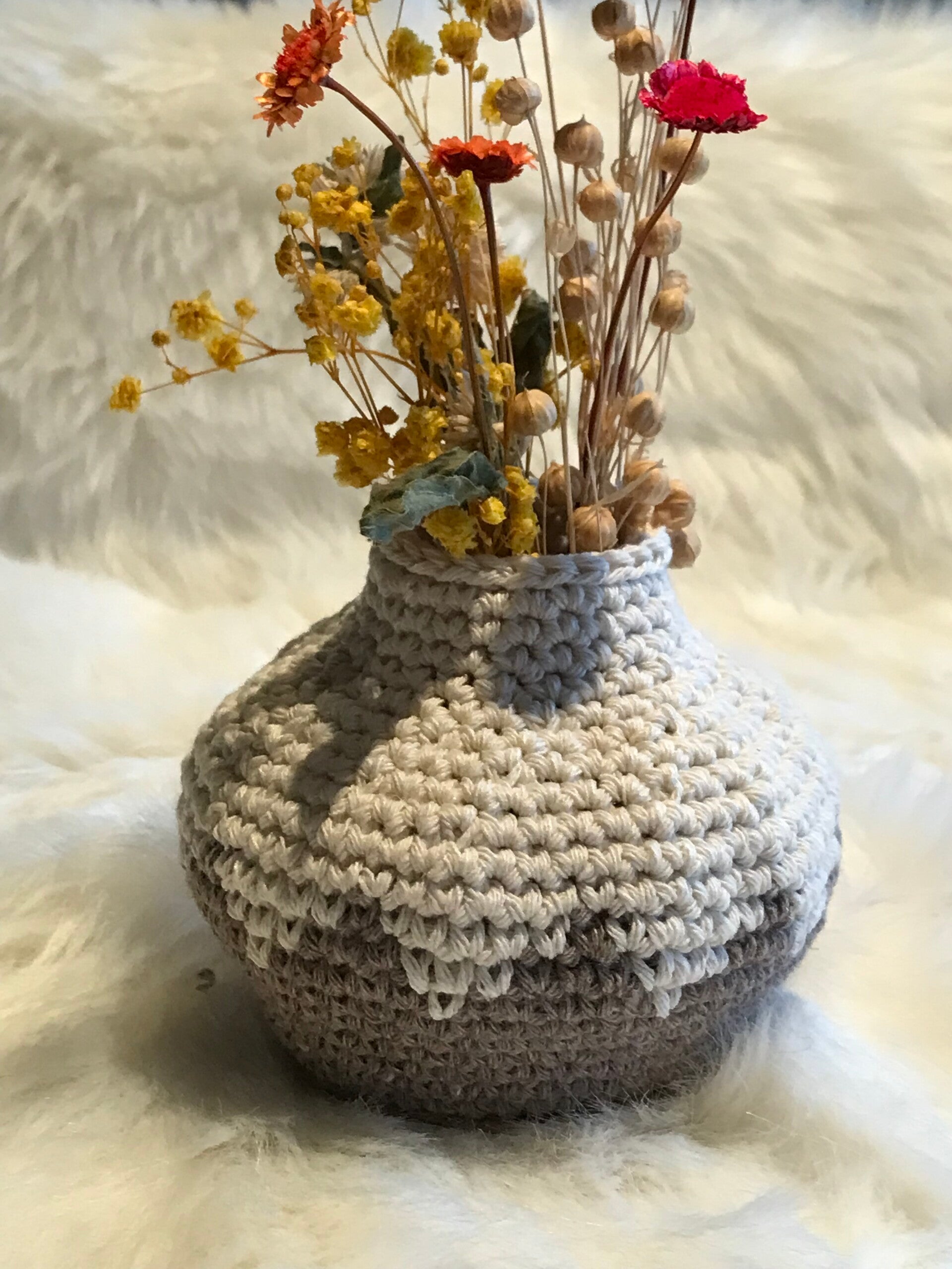 Super leuk haakpatroon voor een gehaakt vaasje, hierin staan een paar kleine droogbloemen helemaal geweldig! Of je haakt een paar bloemen, zie de andere advertenties. Het vaasje is op het breedste deel 12 cm breed en 9cm hoog.