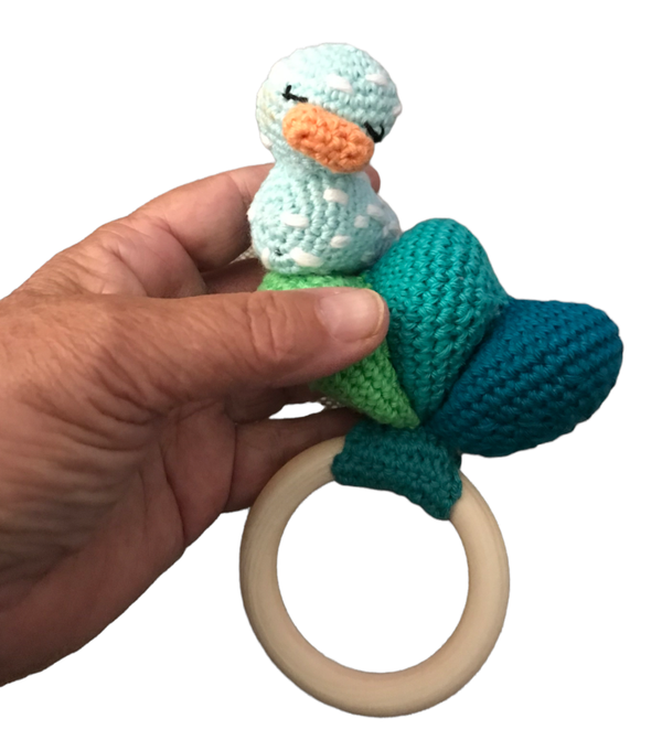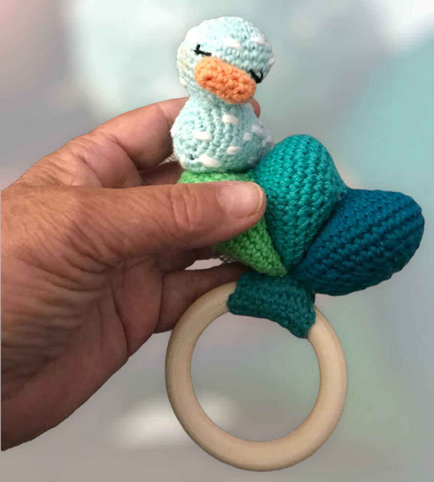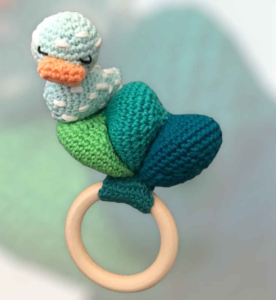 Haakpatroon van een super aparte en mooie bijtring, het eendje zwemt op de golven van de harmonica! Super voor je eigen kleintje of als bijzonder kraamcadeautje!