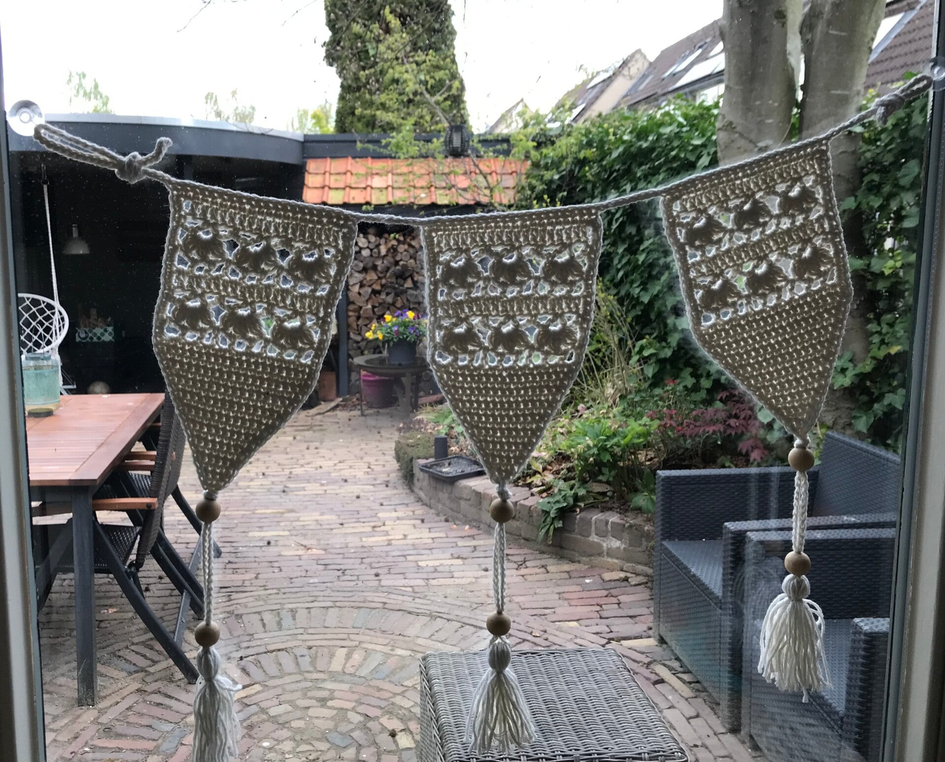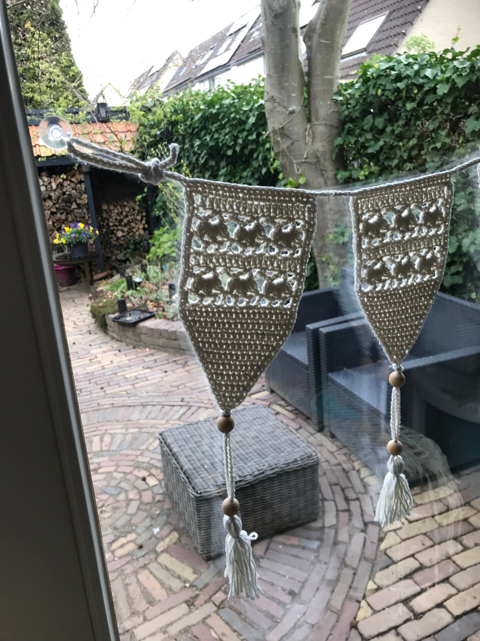Dit is een haakpatroon voor een geweldige slinger voor op het raam van je camper of caravan. Natuurlijk kun je hem ook gewoon op je raam thuis hangen voor het ultieme vakantiegevoel! Met zuignapjes bevestig je hem op je raam. Door meer vlaggen te haken, kun je er natuurlijk ook een fantastische kamerslinger van maken.