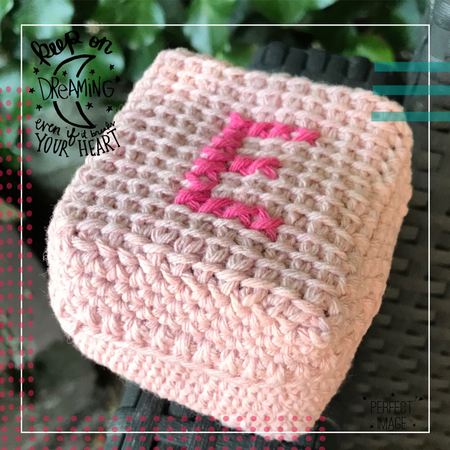 Haakpatroon van een vierkant doosje met een Tunisch gehaakt dekseltje. Op het deksel kunt u een letter borduren. Een super cadeautje! De letter wordt met kruissteekjes op het deksel geborduurd. Het alfabet wordt meegeleverd. Het doosje wordt 5cm hoog en ongeveer 10 bij 10 cm.