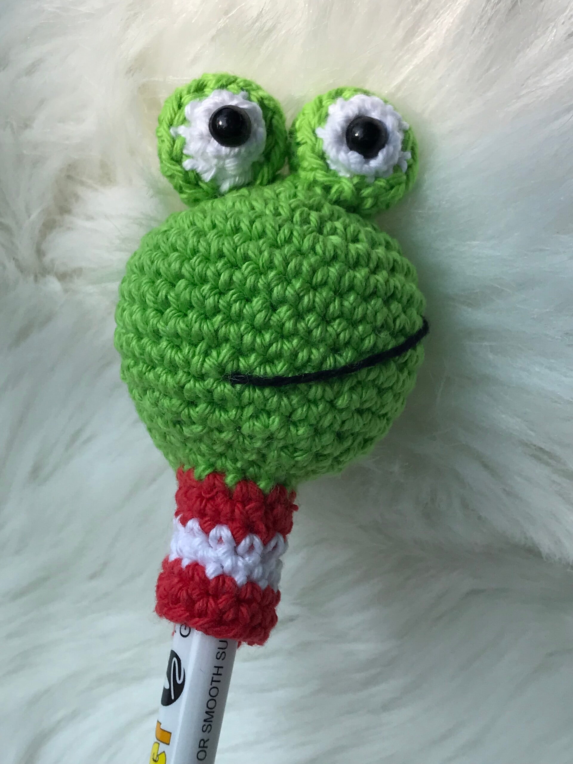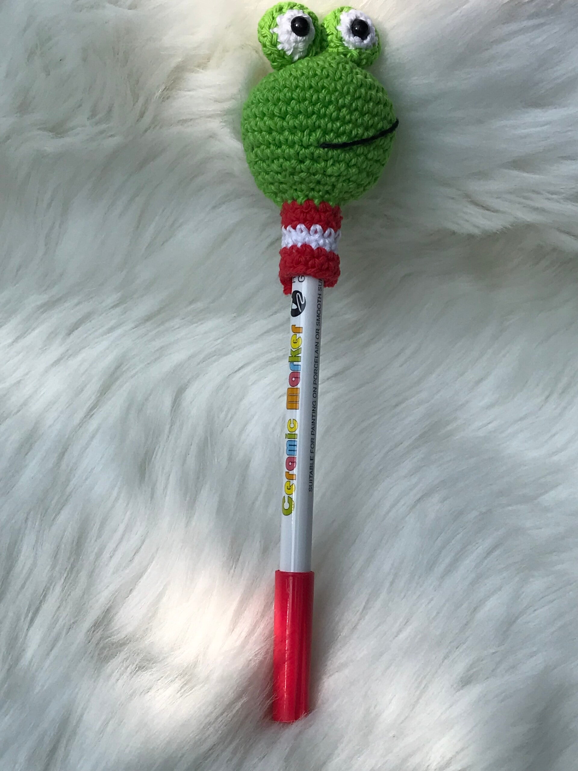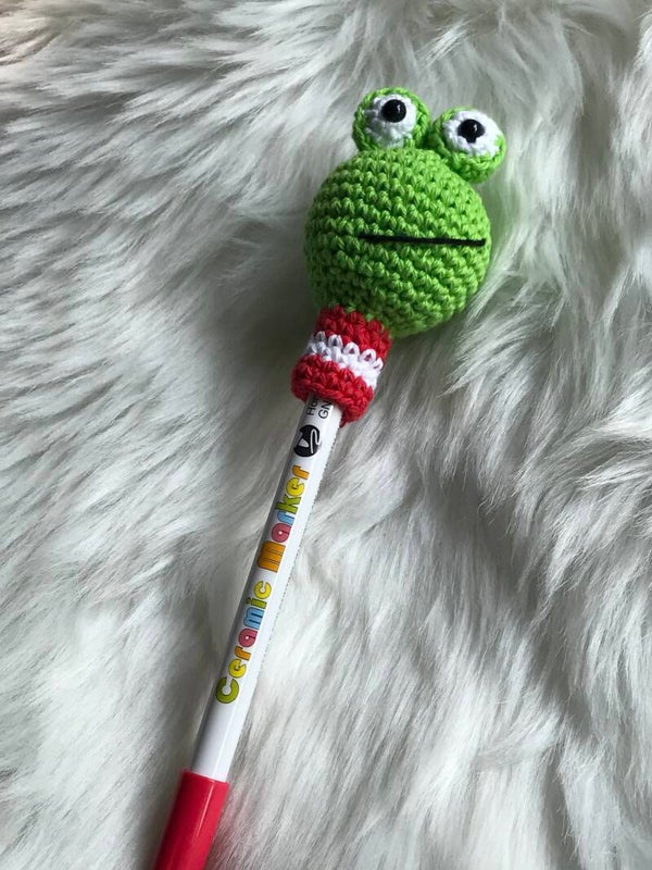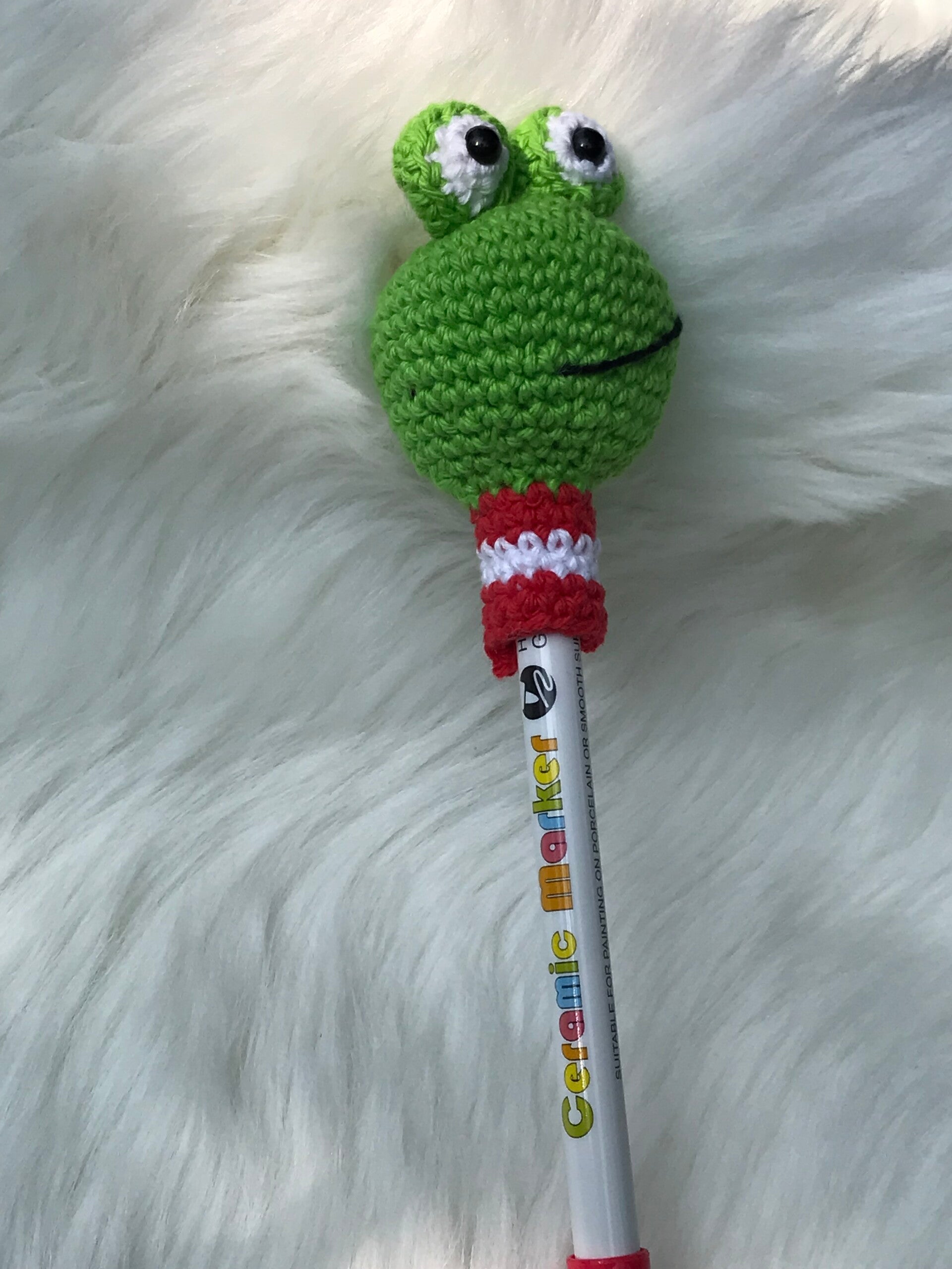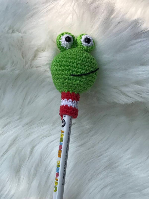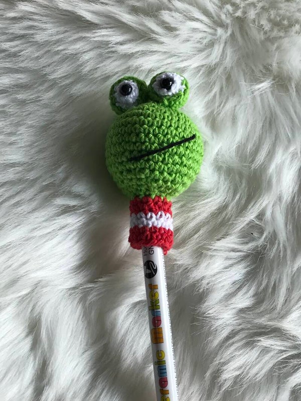 Een van de favorieten van mijn kleinkinderen, terwijl ze de kleurplaten van Kikker inkleuren, zit deze topper op het groene kleurpotlood! Super leuk patroon en natuurlijk ook een leuk cadeautje.