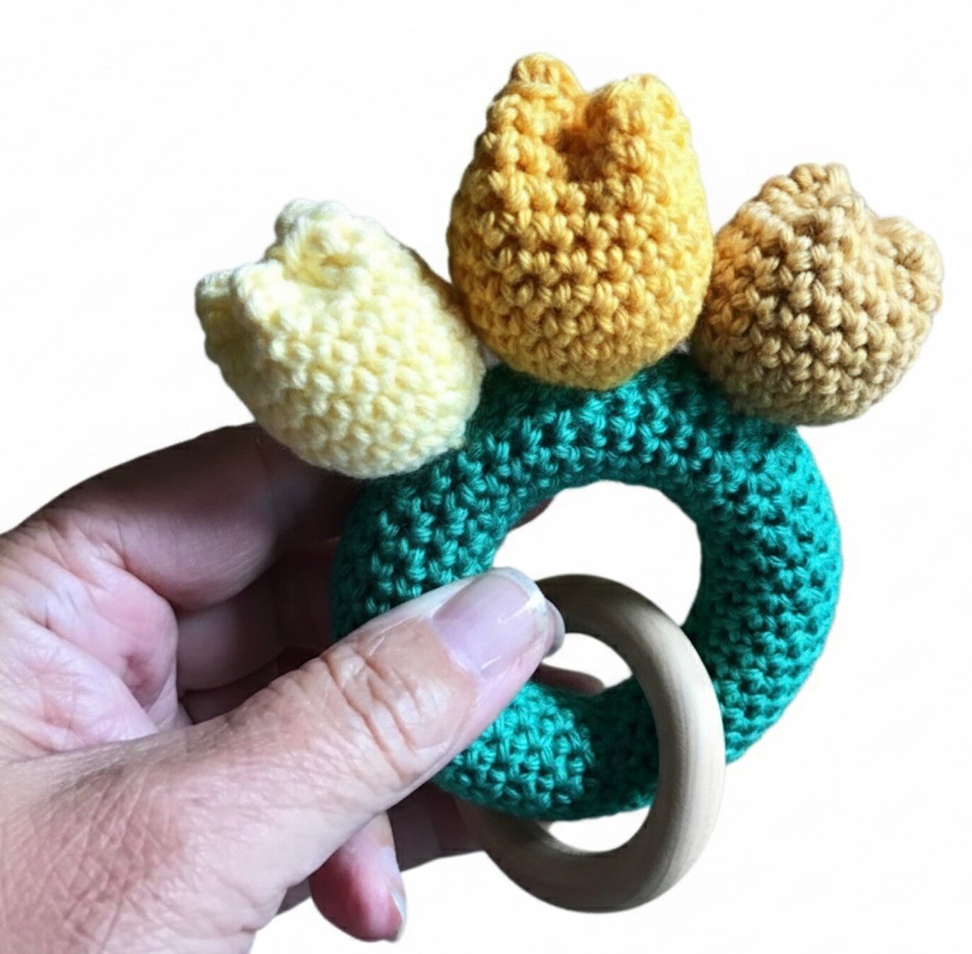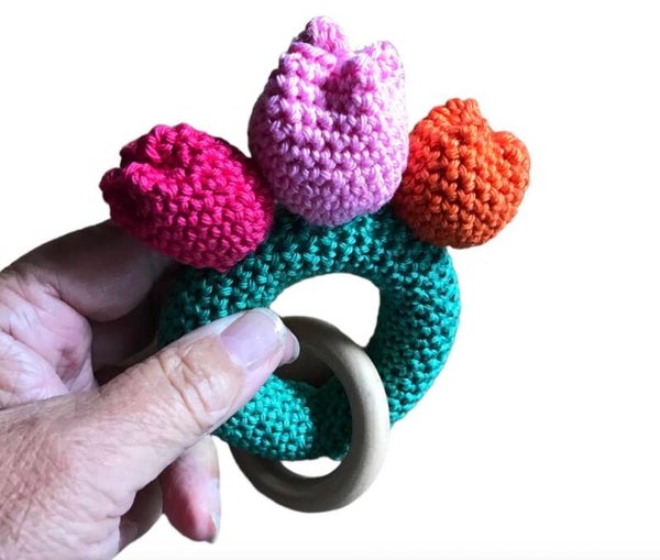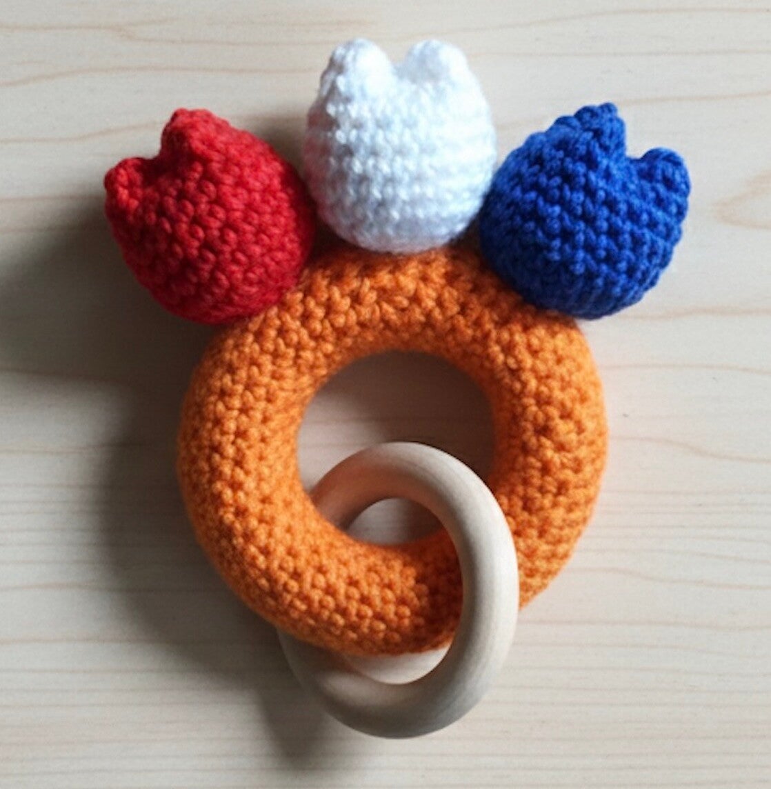 Dit is echt zo'n bijtring die past bij de Lente! Je maakt hem in alle kleuren die je maar wenst. Ik vind zelf de koningsdaguitvoering wel heel erg leuk. Maak hem voor je eigen kleintje of als kraamcadeau.