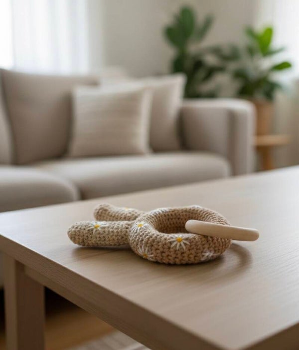 Vind je soms ook speelgoed te opdringerig van kleur voor je kleintje? Mag het voor jou en je kleintje wel wat rustiger? Haak dan deze prachtige bijtring voor je eigen kleintje of als orgineel kraamcadeautje! Het speeltje wordt met houten bijring mee; 14cm hoog bij 8,5 cm breed.