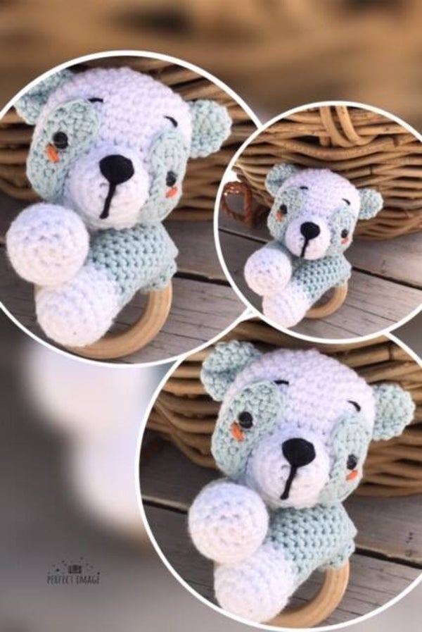 Mooi haakpatroon van een panda bijtring. De bijtring wordt ongeveer 7cm breed en ongeveer 14 cm hoog ( met ring mee). Alles wel afhankelijk van de hand van haken en het gebruikte materiaal!