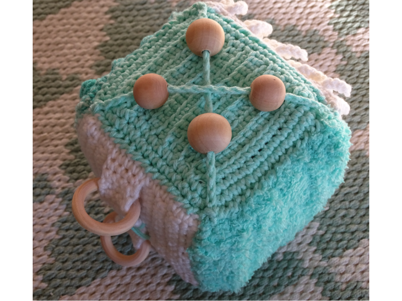 Een haakpatroon voor het maken van een speel/voelblok voor de kleintjes. Het blok stimuleert de tastzin van de baby! Ook voor beginners is het patroon goed te doen door alle toegevoegde foto's en heldere uitleg.
