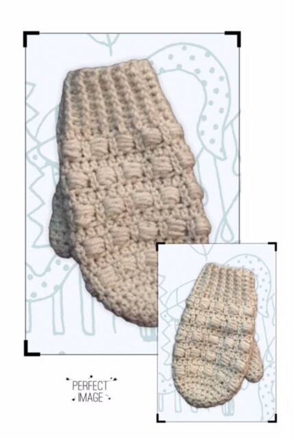 De beschrijving van de wanten is voor drie maten: 18 maanden – 3 jaar (A) en 3-6 jaar (B) en 6-10 jaar (C) en zijn weergegeven als --/--/--