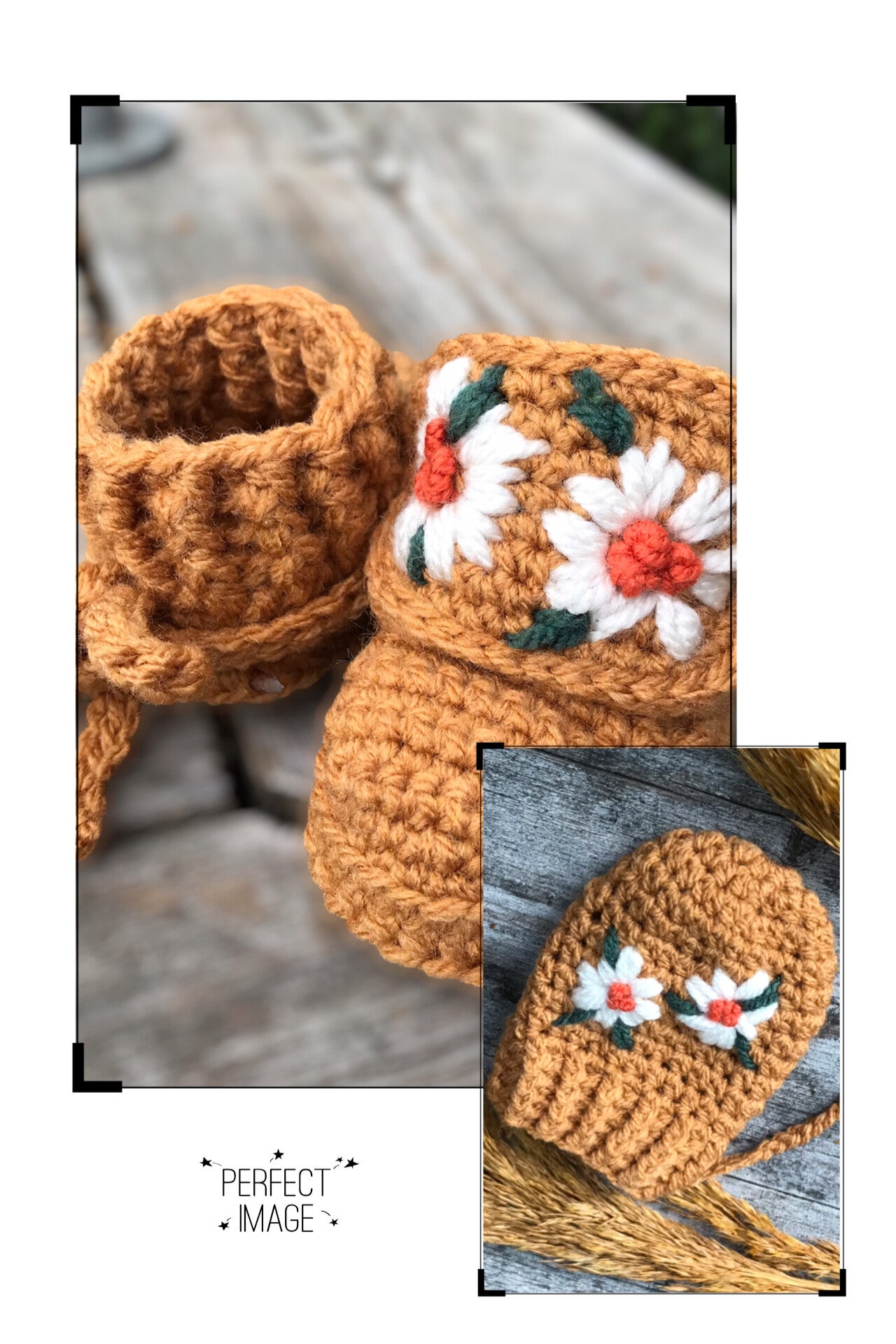 Haakpatroon van een prachtig setje, de geborduurde slofjes en de babywantjes!