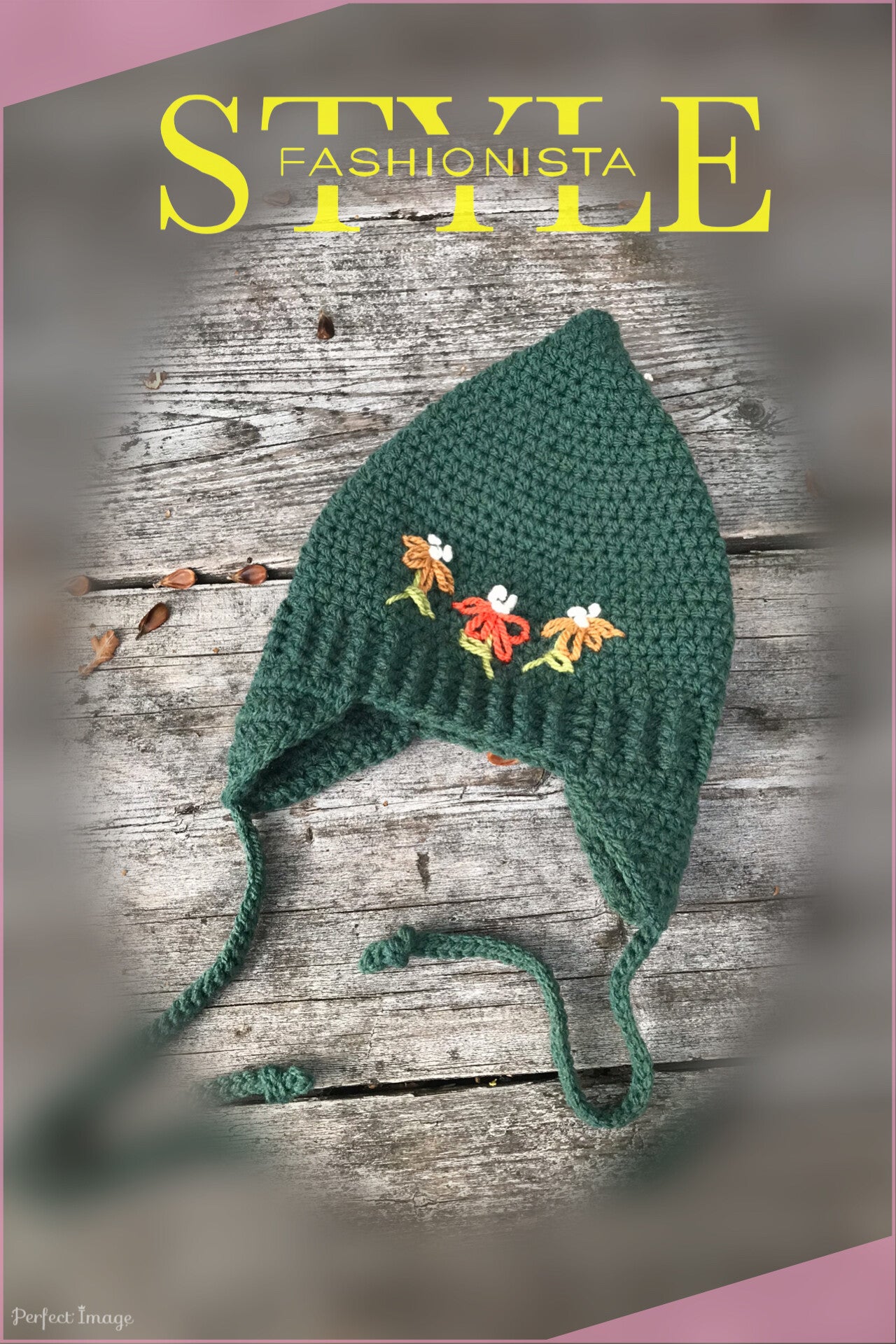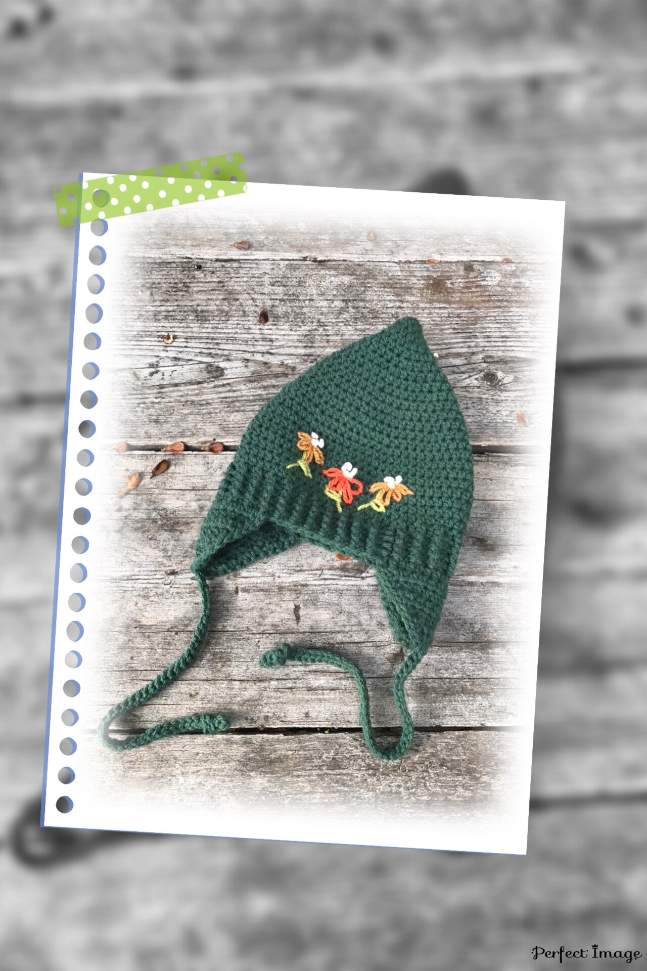 Prachtig haakpatroon van een geborduurde muts met oorflappen.