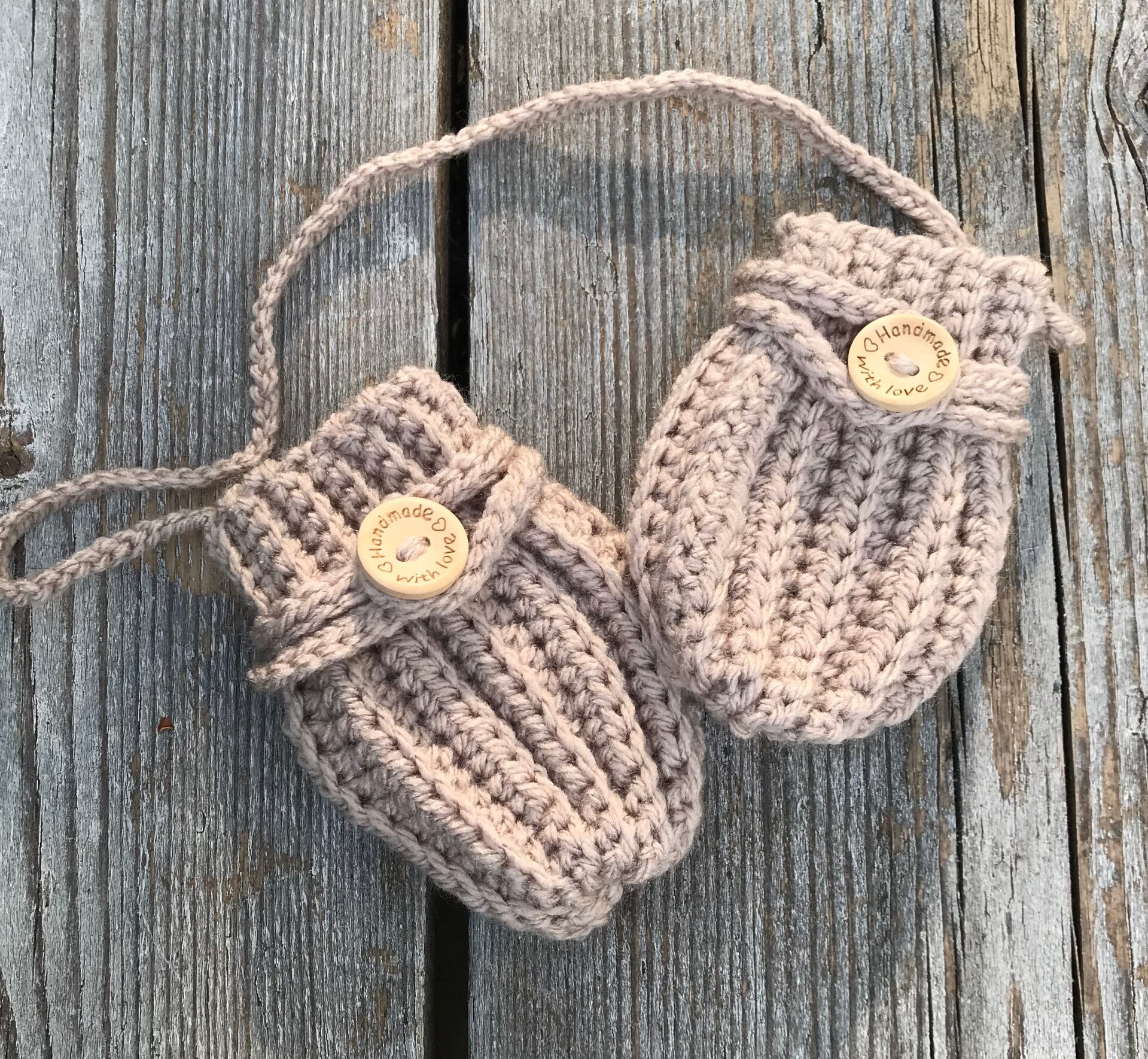 Mooi haakpatroon van lekker warme en mooie babywantjes. Door het bandje blijven de wantjes goed zitten.