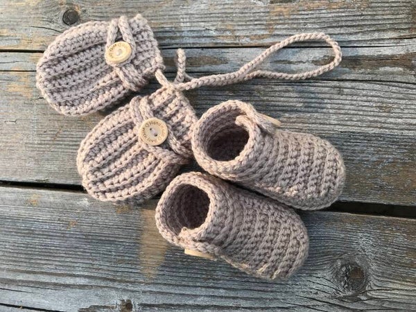 Er is ook een combinatiepatroon van deze wantjes en de slofjes als setje.