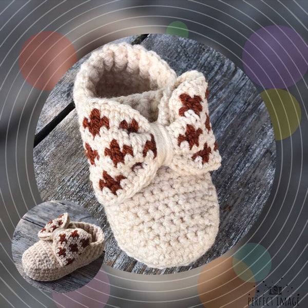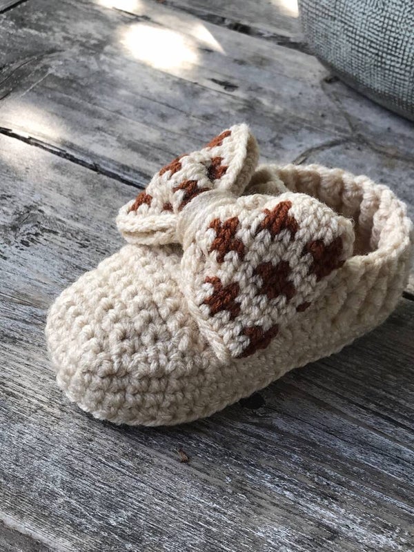 Haakpatroon van prachtige kleuter- kindsloffen, met super strik 2!. Er zijn in dit patroon meerdere maten weergegeven A= maat voor 4 tot 5 jaar, ongeveer 18 cm