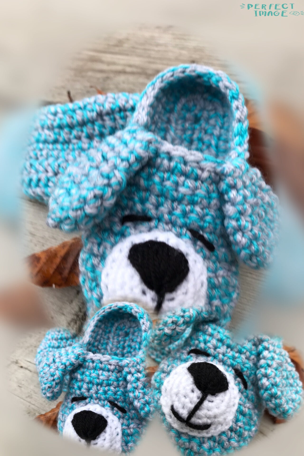 - 1 bol grijze en 1 bol turquoise supersoft, restje wit en zwart. Er wordt gehaakt met twee draden tegelijk op haaknaald 4, het worden dan mooie stevige sloffen. Het gezichtje wordt met enkele draad gehaakt op haaknaald 3