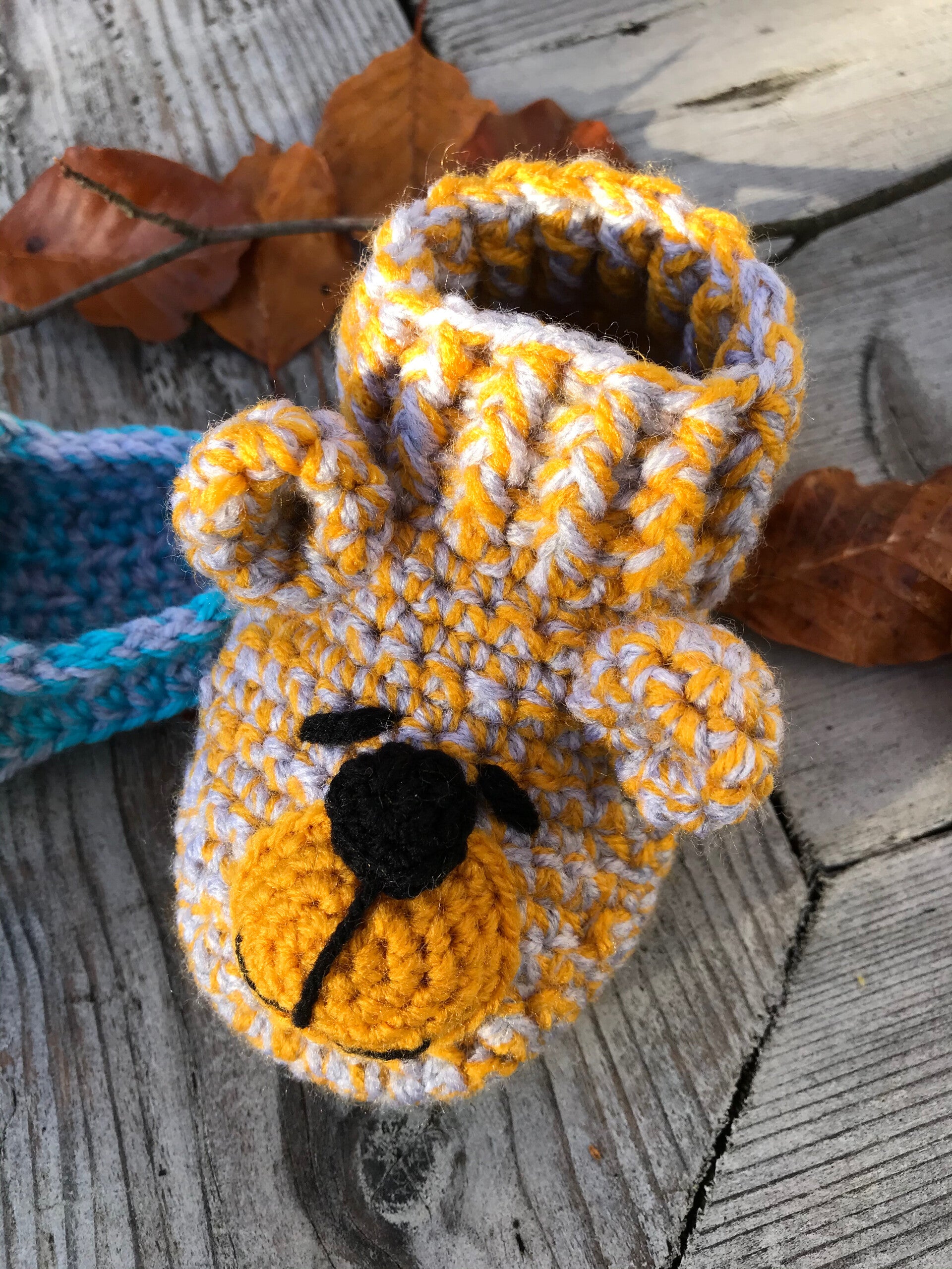 - 1 bol grijze en 1 bol okergele supersoft, restje zwart. Er wordt gehaakt met twee draden tegelijk op haaknaald 4, het worden dan mooie stevige sloffen. Het gezichtje wordt met enkele draad gehaakt op haaknaald 3 De oren met dubbele draad.